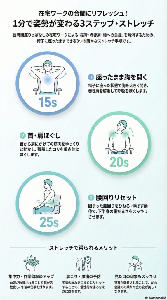 在宅ワークによる体の負担は、日々の小さなストレッチで軽減できます。まずは今日、この後の休憩時間に1分だけ試してみてください。習慣化すれば、あなたのパフォーマンスは驚くほど向上しますよ!